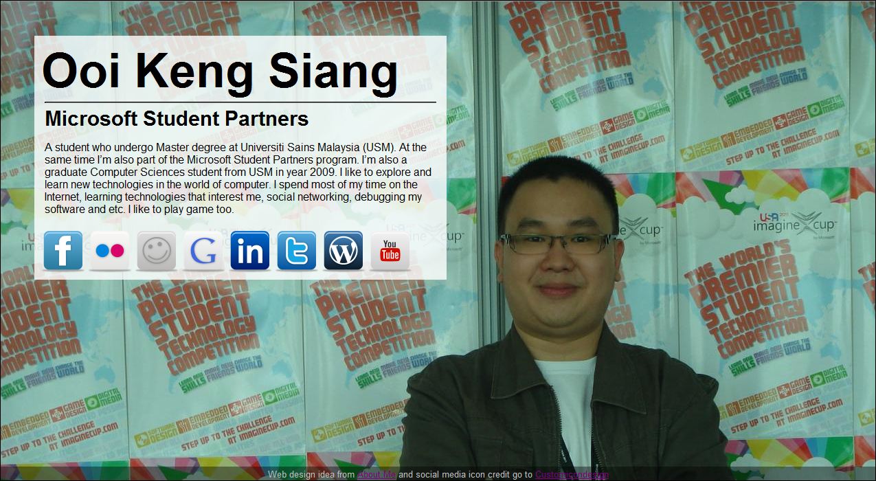 I always wanted to create a very simple business card style web page displaying my basic bio and links to all my social networking site. I admit I only thinking about this without any action for quite some time as I was kind of lazy to pick up HTML and CSS (all the while I only do Silverlight and desktop application development), and I’m not good in design seriously.