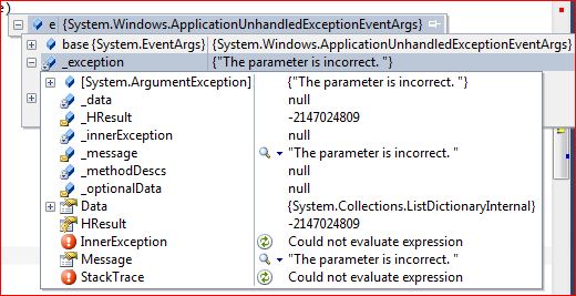 I encounter a situation where I display a list of items in a ListBox on my main page. Then user can to select the item in ListBox and edit or delete the item on the next page. Adding new item to the list or edit the item in the list doesn’t cause any problem at all. But if user delete any item on the second page and go back to the main page, the app will encounter an unexceptional error on App.xmal.cs. The error message show “The parameter is incorrect”, which give me no hint or clue what actually go wrong. Searching on the web for the error message or -2147024809 code give me no result at all.