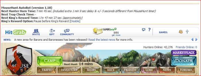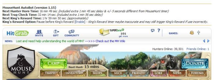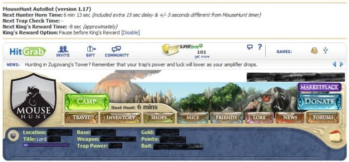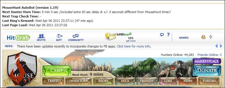 MouseHunt AutoBot is an advance user script to automate sounding the hunter horn in MouseHunt application in Facebook, Hi5 and offside MouseHunt page with MouseHunt version 3.0 (Longtail) supported and many other features. In a simple word, bot for MouseHunt. Time of next hunter horn and trap check will show on the webpage title. The time of the next hunter horn will automatically detected without refreshing the page again. Users can customize the script according to their need by themselves such as add extra random time delay before sounding the hunter horn (Please look for UserPreferenceSetting in the script). Users can choose to bot safety with many safety check features which act like a human, or bot aggressively. Part of the script is actually base on Facebook MouseHunt Game Auto Horn Blower.