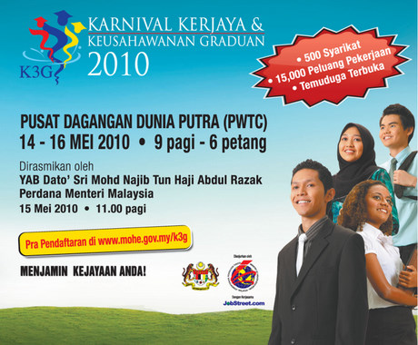 Instead of searching blindly, why not attending the Karnival Kerjaya dan Keusahawanan Graduan 2010 organized by Ministry of Higher Education (MOHE) and collaborated by Jobstreet at Putra World Trade Centre (PWTC), Kaula Lumpur on 14 – 16 May 2010 where you can get all you need at the same place and the same time.