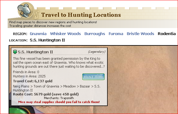 Well, let’s stop talking about my long winded story, I guess no one is interested. Let’s get something to work. Shall I add auto travel function in the script? One click button and the script will help you travel using the cheapest path to destination. I wonder this is violating the term & condition of MouseHunt or not. Another idea is maybe I should just add (not replace!) the feature like travel planner where user can select the departure location and destination they want, because some of the users are actually planing future traveling before they reach that location. So what do you think? Come tell me in the comment!